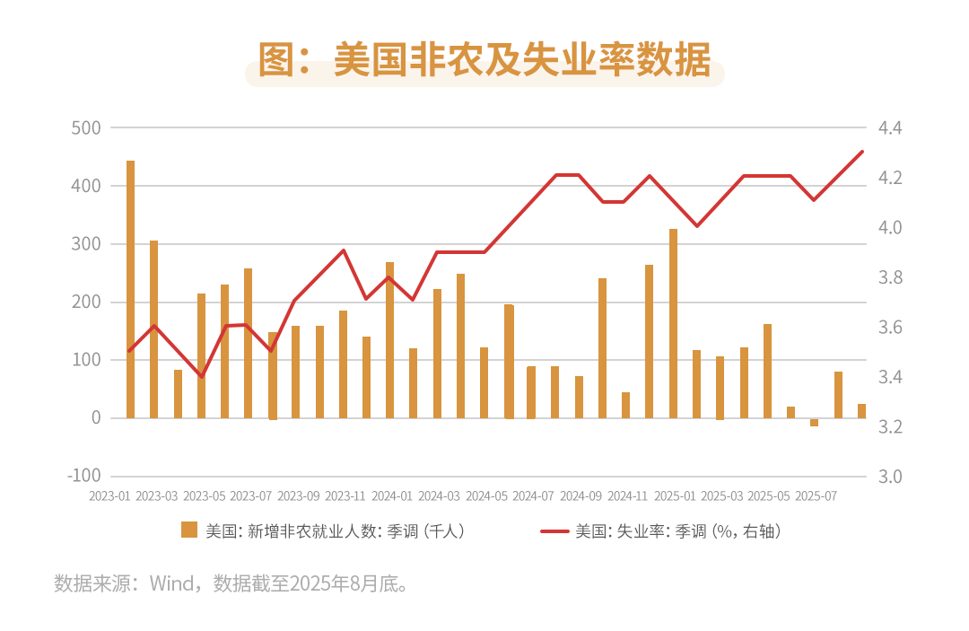 就业市场角度,美国劳动力市场呈现明显降温迹象,2025年8月新增非农就业2.2万人,远不及预期7.5万人,失业率上升0.1pct至4.3%。尽管7月新增非农就业上修,但8月下滑程度显著低于预期,加上6月数据下修为负增,表明近几个月就业中枢明显走低。