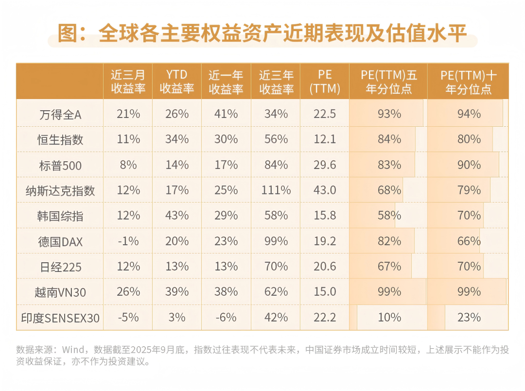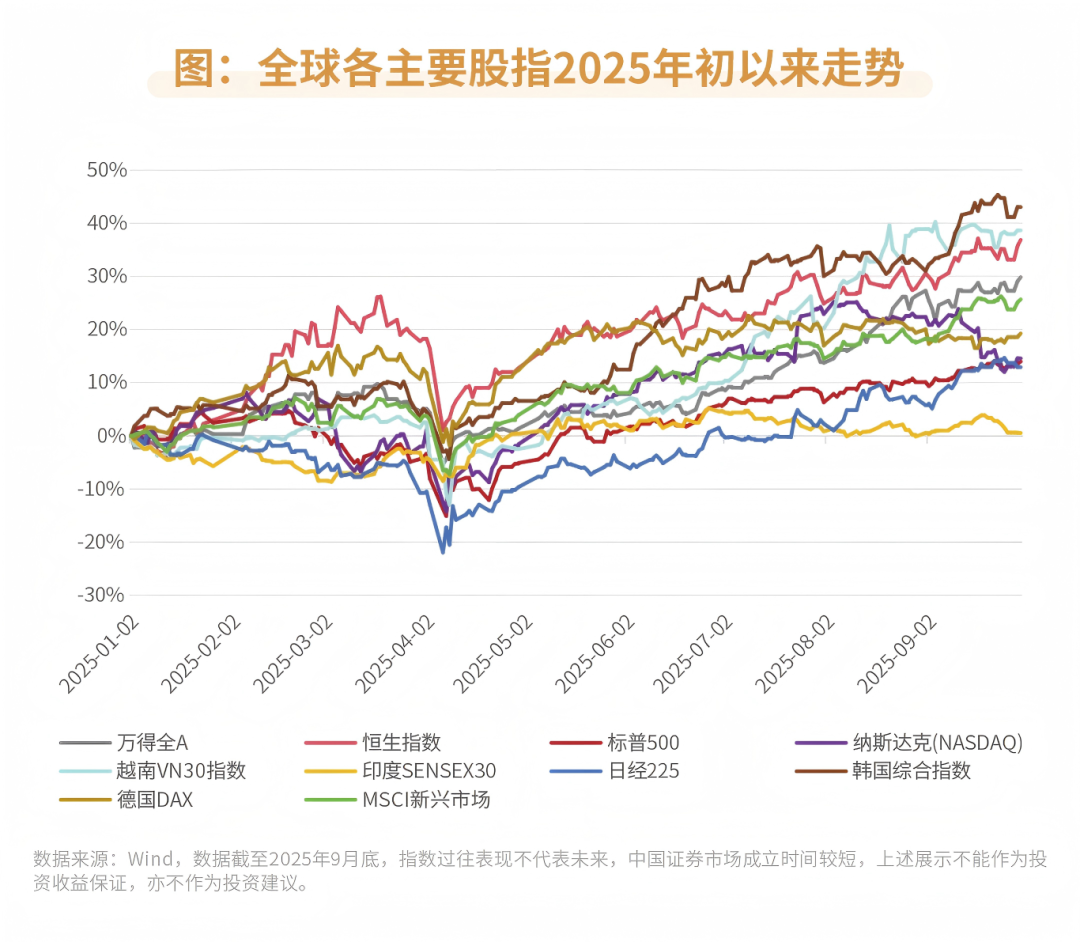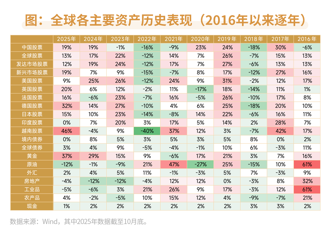 2025年初以来,从关税政策反复调整,到地缘政治冲突持续发酵,全球经济发展面临的挑战不断,不同国家和地区经济发展不均衡的问题也日益凸显。这一背景直接推动不同市场、不同资产的价格分化加剧:房产、股票、黄金等不同资产之间收益差异显著;即便聚焦股票市场内部,投资A股、美股或新兴市场股市,也可能因区域经济周期、政策环境的差异,面临截然不同的投资境遇。