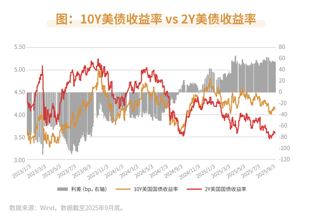 2025年以来,美债2y/10y利差持续走阔,且处在近两年高位。美债10年期和2年期期限利差,自2024年底的30bp持续上升,目前稳定在50-60bp左右,利差背后定价的是目前短债受益于降息周期确定性更高,而长债由于财政赤字、债务风险以及政策不确定性等多种因素风险更大。