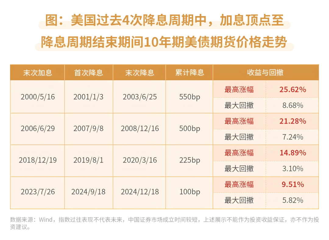 回顾美国降息周期来看,从加息见顶至降息周期结束,美债多录得正收益,其中最近一次降息周期中,10年期美债期货涨幅相对有限,主要系美联储罕见首次降息50BP后,市场一度预计美联储可能保持较快降息节奏,但10月后预期降息幅度缩窄。