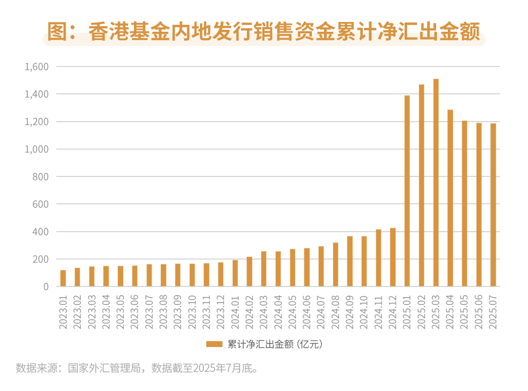 从香港基金内地发行销售资金汇出入情况来看,2024年以后累计净汇出金额逐渐增加,2024年末达到426.65亿元;2025年互认基金客地销售比例放宽后,大量资金涌入互认基金,累计净汇出金额大幅增长,2025年1月跃升至 1390.56亿元,之后两个月保持增长。2025年7月,累计净汇出金额连续4个月有所减少,回落至1187.78亿元,但降幅放缓。