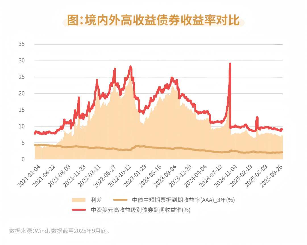近年来,南向通扩容促进跨境投资渠道拓宽,境内机构对点心债的配置需求不断增长。以某AA+评级境内主体为例,2025年以来该主体发行的离岸债收益率在7-9%区间,而同主体相似期限的境内债收益率在3%以下,离岸债较境内债利差虽有所下降,但仍在500bp左右。在同等信用资质的前提下,点心债相较于境内债,能够提供更高的信用利差回报。当前境内市场持续处于低利率环境,优质资产收益空间不断收窄,而点心债这一利差优势,使其具备了显著的超额收益挖掘价值,成为优化资产配置、提升组合收益的重要标的选择。