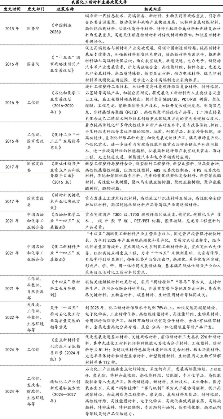 化工新材料包括高端聚烯烃材料、工程塑料、聚氨酯材料、氟硅树脂、特种合成橡胶和热塑性弹性体、高性能纤维及复合材料、功能性膜材料、电子化学品、无机功能材料、新能源材料、生物基材料等以及其他特种功能材料等多个品类九鼎。