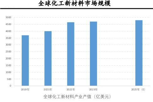 机构预计2025年全球化工新材料市场规模将达到4800亿美元,2019~2025年复合增速达4.40%,到2030年规模有望接近1.2万亿美元,其中亚太地区将占据近50%的市场份额。