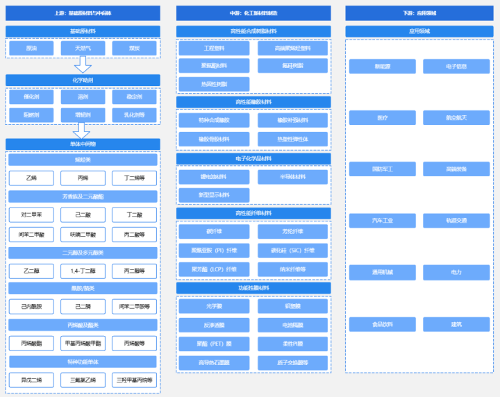 化工新材料作为支撑现代工业,特别是战略性新兴产业发展的关键物质基础,产业链涵盖上游基础原材料与单体、中游化工新材料制造以及下游广泛的应用领域。